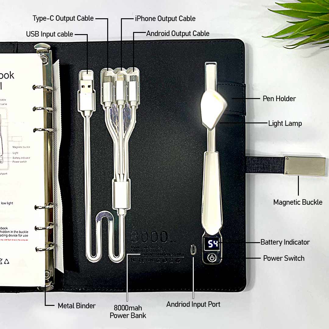 The magnet buckle is your USB flash drive.Charge your phone by simply put the phone on the cover. The battery indicator of the power bank is inside of the notebook.Three different charging tips will meet your everyday demands.With extra card slots and cash slots, you don’t need to carry your wallet anymore.You can refill the bind after use up the paper.The LED logo will also make your notebook special.  *Note: You can DIY your own logo with a minimum of 200 book notes purchases.Dimensions: