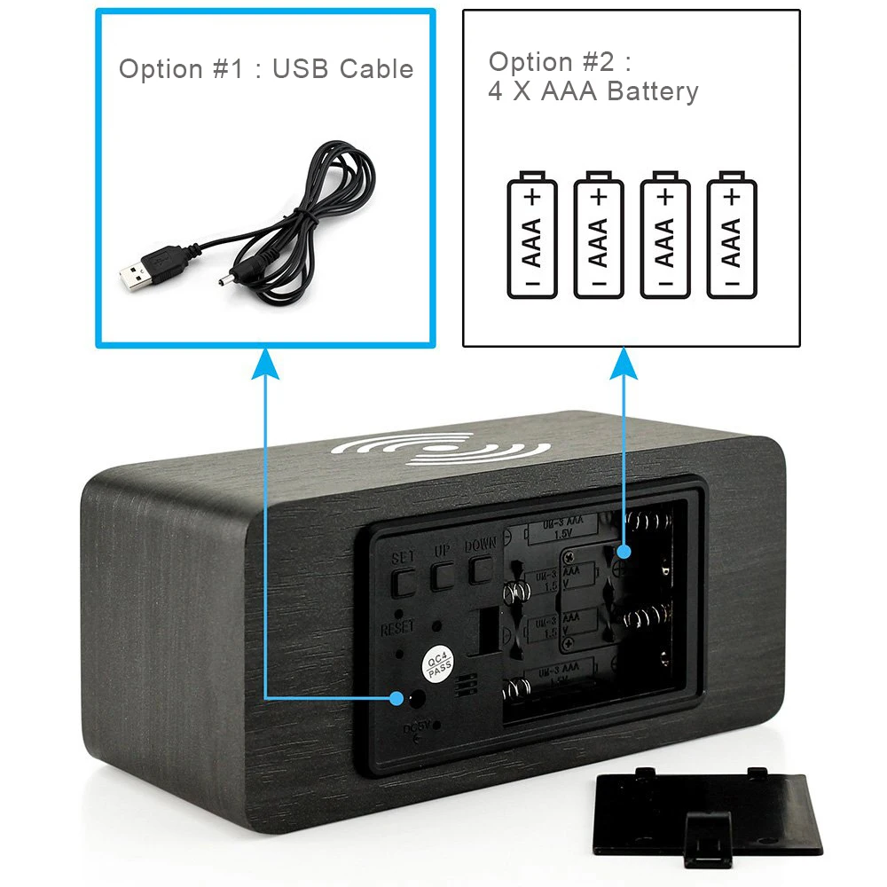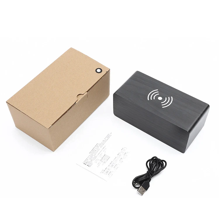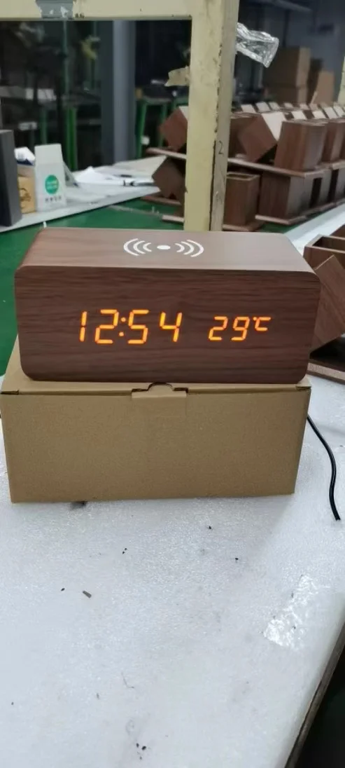 LED wood alarm clock dual display time temperature alarm clock voice-activated alarm clock wireless charger